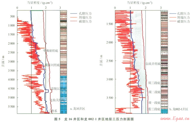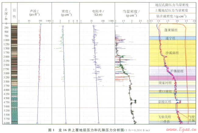 龍16井陸相地層的聲波、密度和電阻率3條曲線從中侏羅統(tǒng)沙溪廟組下部開始出現(xiàn)明顯偏離泥巖正常壓實趨勢[5](圖1)。因此判斷地層孔隙壓力白沙溪廟下部逐漸升高,部分井上三疊統(tǒng)須家河組的地層壓力系數(shù)高達(dá)l.83,本區(qū)實測壓力數(shù)據(jù)、鉆井液氣侵等現(xiàn)象也說明了須家河組具有較高的壓力異常。海相地層孔隙壓力形成機理和預(yù)測方法比較復(fù)雜,通過各井鉆井液密度、漏失和氣浸溢流等現(xiàn)象分析,認(rèn)為部分井段碳酸鹽地層壓力系數(shù)最高至2.15(如下三疊統(tǒng)嘉陵江組嘉二段高壓鹽水層)。