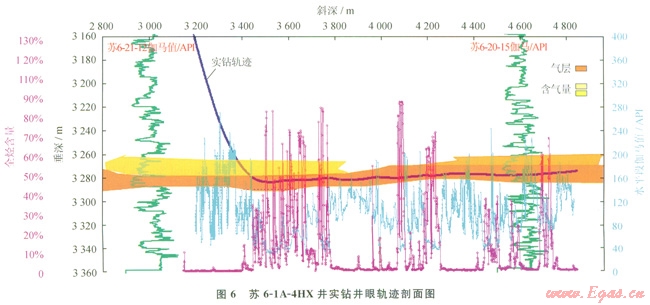 蘇里格氣田儲層含氣砂體薄,傾角變化大,LWD測點監(jiān)測儲層信息滯后于鉆頭位置,實鉆過程中井眼軌跡調(diào)整頻繁,砂體有效鉆遇率低。為提高氣層有效鉆遇率,提高鉆井速度,針對軌跡控制難題,通過鉆具力學分析與儲集砂體走向評價,改變了以往的鉆具組合,實施近鉆頭測量[14],形成了“精確監(jiān)控、緩慢糾偏、斜有余地、穩(wěn)斜探頂”的軌跡控制技術(shù)。該項技術(shù)能夠及時掌握實鉆軌跡,并根據(jù)地質(zhì)提示提前做出調(diào)整,避免軌跡大幅度變化,降低了軌跡控制難度,提高了砂體有效鉆遇率,縮短了鉆井周期。2010年該技術(shù)在蘇61A-4HX井應用,實現(xiàn)了砂層鉆遇率85.6%,氣層(含氣層)鉆遇率67.6%的突破(圖6)。2011年該技術(shù)在蘇里格氣田實現(xiàn)規(guī)模應用,先后鉆井l63口,平均砂巖鉆遇率81.4%,氣層(含氣層)鉆遇率65.5%。