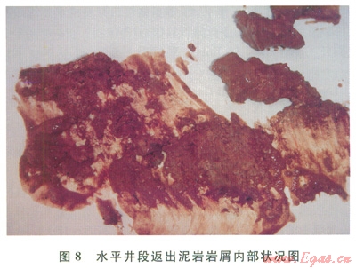 該體系2011年開始在水平井規(guī)模推廣,現(xiàn)場應用累計超過80井次,平均縮短水平井段施工周期5~8d,應用效果表明,無土相暫堵鉆(完)井液體系潤滑防卡性能好、低剪切速率下攜屑能力強,返出H泥巖巖屑內(nèi)部呈干態(tài),表明抑制性良好,未出現(xiàn)吸水膨脹現(xiàn)象(圖8)。