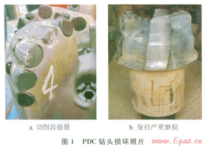 蘇里格氣田屬于非均質(zhì)性極強的致密巖性氣田,儲層深度達3500m,鉆遇地層中的白堊系、侏羅系、三疊系、二疊系等地層硬度高、可鉆性差,其中紙坊組一石千峰組為含礫石夾層砂巖,鉆時極慢,直井段平均機械鉆速5.37m/h,斜井段復合鉆進平均機械鉆速1.01m/h,滑動鉆進平均機械鉆速0.35m/h。鉆進時蹩跳嚴重,往往造成PDC鉆頭切削齒崩裂、肩部齒脫落、保徑嚴重磨損等早期損壞(圖1)。