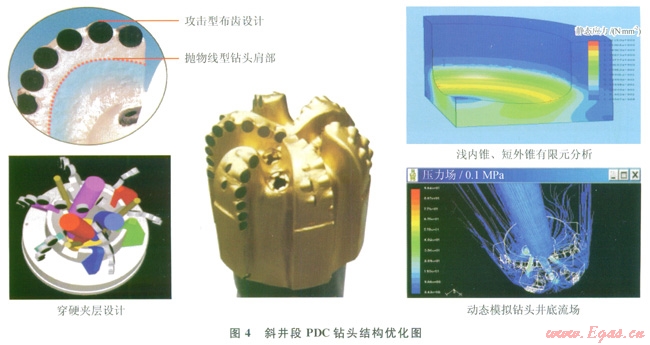 對其模擬定向鉆進有限元力學分析表明,在一定的鉆壓下,短外錐的PDC鉆頭受力均勻,拋物線形鉆頭肩部外形的連續(xù)性過渡可消除集中點載荷,這更有利于PDC鉆頭的穩(wěn)定性。外錐短拋物線可以減小鉆頭與井壁的接觸面積,從而減小鉆頭與井壁之間的摩擦力,減輕鉆頭與井壁摩擦導致的鉆頭渦動,提高了鉆頭定向反應靈敏度。攻擊型布齒設(shè)計既保證鉆頭能吃入硬夾層,且鉆頭鉆出硬夾層時切削齒不損壞。此外,增加鉆頭鼻部至保徑部分切削齒的投影密度,有利于保護切削齒,增強鉆頭穿硬夾層的能力和加強保徑的能力。在斜井段施工過程中,這種結(jié)構(gòu)的PDC鉆頭在較小的鉆壓下就能獲得比常規(guī)PDC鉆頭更高的鉆速,同時由于扭矩較小,鉆頭穩(wěn)定性強,工具面更加穩(wěn)定,使斜井段平均機械鉆速、單只鉆頭進尺與壽命大幅提高。