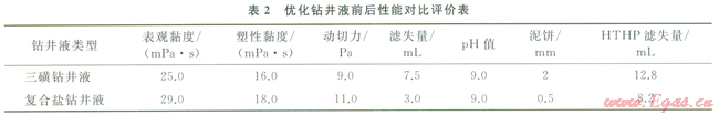 通過對“石千峰組、石盒子組”地層坍塌機理研究,從強化封堵、抑制膨脹和力學平衡三方面進行攻關(guān),研制出CQSP-X強抑制無土相復合鹽鉆井液體系。體系配方為:1.5%SFT-1+1%SMP-2+0.3%CMC(PAC)+0.5%HL60+0.2%NaOH+0.5%CMS+4%~5%QS~4+10%~l5%KCI+10%WT-l。其豐要性能與三磺鉆井液體系對比如表2所示??梢钥闯觯w系防塌能力強、潤滑防卡性能好、低剪切速率下攜屑能力強。