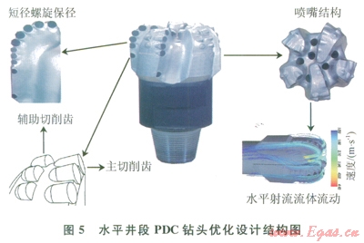 經(jīng)過對蘇里格氣田巖石可鉆性、鉆頭破碎規(guī)律進行分析,并結(jié)合巖心、測井等資料,針對硬夾層設(shè)計了雙重保護切削結(jié)構(gòu),減小鉆頭震動,提高鉆頭抗沖擊能力及耐磨性[12]。根據(jù)鉆頭水平井段鉆進時水平射流流體流動場,調(diào)整鉆頭噴嘴的方位角和噴射角度,增加鉆頭排屑槽面積,降低水力能量對切削齒和刀翼體的沖蝕。此外,根據(jù)水平井段施工穩(wěn)斜的需要,設(shè)計了短徑螺旋保徑5刀翼結(jié)構(gòu),減小PDC鉆頭反扭矩,提高鉆頭定向和穩(wěn)斜能力[13](圖5)。