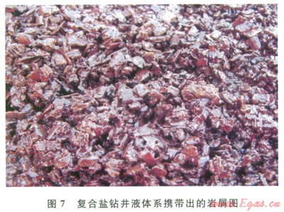 復合鹽鉆井液體系2011年開始在水平井全面推廣,累計應用約100口井,平均縮短斜井段施工周期7~10d。有效抑制了石千峰組、石盒子組的坍塌,克服了PDC鉆頭泥包、黏卡等施工難題,攜帶出的巖屑棱角分明、形狀規(guī)整、無吸水膨脹,如圖7所示。
