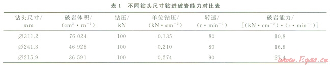針對蘇里格氣田地層巖心可鉆性分析,并對不同鉆頭尺寸模擬水平井鉆進參數(shù)時的機械破巖能力進行對比,由表l可以看出,Æ215.9 mm鉆頭在一定條件下,破巖能力最強。斜井段優(yōu)化為Æ215.9mm井眼可大幅提高機械鉆速。