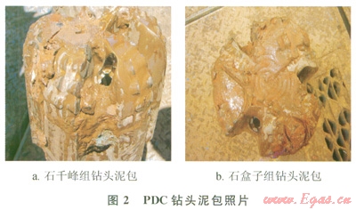 斜井段鉆遇二疊系中的石千峰組、石盒子組多為黏性很強的泥巖,極易黏附在PDC鉆頭上,堵塞噴嘴,形成泥包(圖2),造成機械鉆速大幅度降低、泵壓升高、甚至鉆頭長時間無進尺。