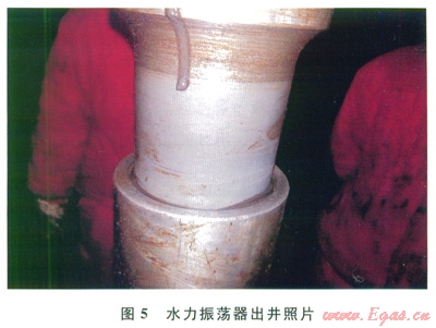 該井鉆至6069m,為了提高滑動(dòng)施工效率,水平段鉆具組合中應(yīng)用了水力振蕩器。根據(jù)水力振蕩器安裝原則,在鉆具組合中距離鉆頭位置的已鉆水平段長度的l/3處安裝,即該趟鉆中水力振蕩器距離鉆頭位置720m。在不同排量的情況下,在井口對水力振蕩器進(jìn)行壓力測試(表1)。下鉆到底后,泵沖65沖/min,泵壓23.0MPa,加壓至40~60kN,泵壓24.5~25.2MPa(未使用水力振蕩器時(shí),泵沖65沖/min,泵壓是23~25MPa)。復(fù)合鉆進(jìn)至井深6105m,進(jìn)尺36m后需要調(diào)整軌跡進(jìn)行滑動(dòng)鉆進(jìn),但活動(dòng)鉆具上提摩擦阻力18t,下放28~40t,經(jīng)過多次劃眼后,下放摩擦阻力依然較高,在20~30t(圖2),調(diào)整工具面依然困難,滑動(dòng)鉆進(jìn)效果差。進(jìn)行多次嘗試后,工具面依然調(diào)整困難。通過調(diào)整泵沖,改變排量,鉆進(jìn)至6415m,鵝頸管刺漏起鉆。起出水力振蕩器后井口測試,工具不工作,振動(dòng)短節(jié)不振動(dòng),而且振動(dòng)短節(jié)振動(dòng)處有膠皮露出,這可能導(dǎo)致其在使用進(jìn)尺36m后,不能起到傳遞鉆壓和振動(dòng)效果的原因(圖5)。