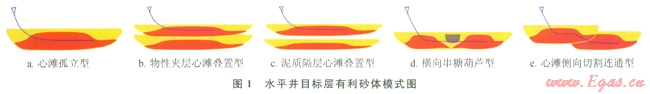 通過儲層精細描述,水平井部署區(qū)域地質(zhì)情況基本清楚,最終確定水平井目標層。從蘇里格氣田沉積地質(zhì)特征來看,目前水平井部署主要有5種有利砂體模式:①心灘孤立型(圖1-a);②物性夾層心灘疊置型(圖1-b);③泥質(zhì)隔層心灘疊置型(圖1-c);④橫向串糖葫蘆型(圖1 d);⑤心灘側(cè)向切割連通型(圖]-e)。根據(jù)部署區(qū)域砂體或疊置砂體類型情況,優(yōu)選出一種砂體模式或砂體模式組合作為水平井目標層。