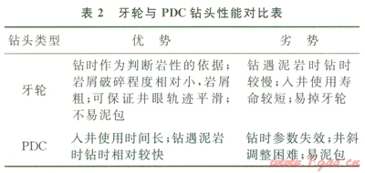在保證施工質(zhì)量和安全的前提下,為了加快鉆井速度,優(yōu)化了鉆頭選型。主要采用以下兩種優(yōu)化模式:①斜井段采用“1+1”模式;②水平段采用“N+1”模式。“1+1”模式指一個牙輪鉆頭加一個PDC鉆頭,“N+1”模式指多個PDC鉆頭加一個牙輪鉆頭。牙輪鉆頭作為備用,當發(fā)生巖性相變等特殊情況時,用于快速調(diào)整井斜川(表2)。