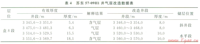為實現(xiàn)多段儲層同時開發(fā),使用水平段裸眼封隔器+斜井段傳輸射孔組合工具進行多段儲層壓裂改造,既提高了儲量動用程度,又提高了單井產(chǎn)量。以蘇里格氣田東區(qū)蘇東57-09H1井為例(表4),水平段有效儲層長度僅97m,通過縱向斜井段與水平段儲層多段同時改造,試氣獲得無阻流量36.4×104m3/d,取得了顯著效果。