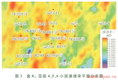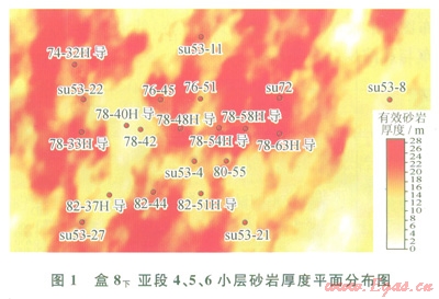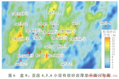 在有效厚度三維模型的基礎(chǔ)上,提取了各小層有效厚度的疊合圖,形成盒8下亞段4、5、6小層的有效厚度疊合圖(圖6),從平面上反映r有效儲層的分布范圍和趨勢。通過地質(zhì)建模預(yù)測盒8下亞段4、5、6小層累計有效砂巖厚度為0~22m,基本呈連片分布,與沉積特征相一致,該區(qū)中部、南部及西部的78-33H導(dǎo)井區(qū)有效厚度最大,達(dá)到20m左右;低值區(qū)主要分布在蘇53-7井東部、82-37H導(dǎo)井區(qū)、蘇53-8井區(qū)附近等,有效厚度小于3m,反映了區(qū)內(nèi)氣藏的分布規(guī)律。