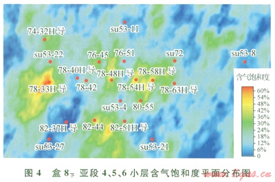 區(qū)塊含氣飽和度分布與滲透率分布類似(圖4),盒84、盒85、盒86小層發(fā)育程度較好,含氣飽和度較高的區(qū)域大部分集中在該區(qū)中部,達(dá)到50%,局部含氣飽和度超過高達(dá)80%。