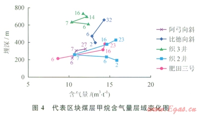 在層域上剔除垂向上埋深不是遞增的數(shù)據(jù),7號煤層(或6號煤層)以淺的含煤層域,煤層含氣量一般隨煤層埋深的增大而減小,過7號煤層(或6號煤層)后,隨層域埋深的增高,煤層含氣量一般有增高的趨勢。在垂向上煤田總體顯示甲烷含量隨埋深的增加而增加(圖4)。不同層位的煤層含氣量的變化規(guī)律指示,研究區(qū)內不同向斜單元在縱向上不同煤層可能存在多個獨立的含煤層氣系統(tǒng)[7,18]。