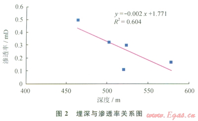 區(qū)內比德向斜注入壓降法試井滲透率為0.1074~0.50016mD(表1),平均為0.279688mD,為中滲透率煤儲層;在層域上,滲透率和埋深的相關關系較好,滲透率隨埋深增大而減小(圖2)。三塘向斜織3井16號煤層及珠藏向斜織2井23號煤層儲層滲透率分別為0.000514mD、0.000164mD,均屬低滲透率煤儲層。