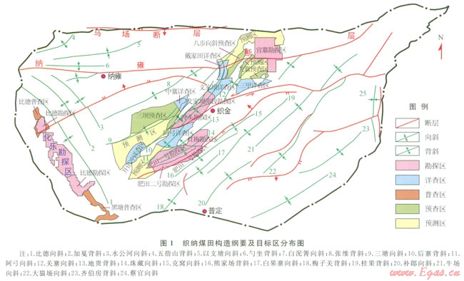 織納煤田位于貴州省中西部,主要包括比德向斜、三塘向斜、阿弓向斜、珠藏向斜、關寨向斜5個向斜單元,含煤面積約為l016.3km2,區(qū)內煤田地質工作程度高,除煤炭預測及預查區(qū)外,煤炭勘查面積達695.64km2,煤炭總資源量為90.33×108t;據(jù)貴州省煤田地質局l996年提交的“貴州省煤層氣資源評價報告”[1],織納煤田煤層氣資源量為7611×108m3,但該區(qū)煤層氣的系統(tǒng)評價還很薄弱。因此,對煤出煤層氣資源狀況、賦存條件進行全面分析和評價,優(yōu)選煤層氣重點勘查和開發(fā)區(qū)塊很有必要[2-4]。