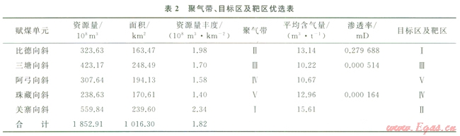 煤層氣勘探目標區(qū)應是蘊藏有一定資源量、并具有煤層氣富集高產潛勢的地區(qū)。因此,煤儲層含氣量和滲透率是應優(yōu)先考慮的兩個關鍵控氣因素,面積和資源豐度(兩者之積為煤層氣資源量)對目標區(qū)的經(jīng)濟價值也具有決定性意義。按照遞階優(yōu)選法,按聚氣帶®目標區(qū)®靶區(qū)的遞階層次進行選區(qū)評價和優(yōu)選,優(yōu)選的關鍵主要在于煤儲層面積、含氣量、儲層滲透率和臨儲壓力比5個要素[7,19-21]。