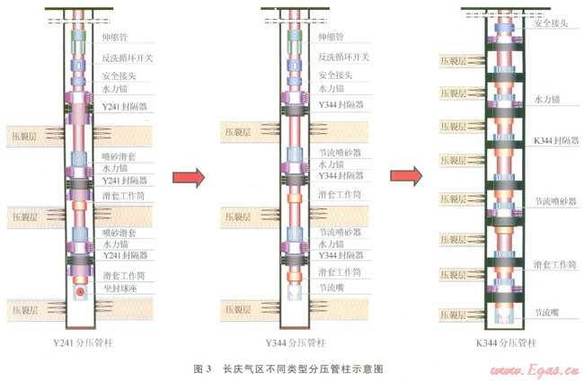 通過優(yōu)化井身剖面和“四合一”鉆具組合[12],實現(xiàn)小位移井“1~2趟鉆”,大位移(超過850m)井“2~3趟鉆”,提高了鉆井效率。平均鉆井周期21.7d,最短鉆井周期l3d;平均水平位移914.5m,最大位移達到1400m。建立“設計四防碰,施工三預防,空間三繞障”防碰繞障理論體系,采用軌跡空間球面掃描方法,模擬井身軌跡空間展布與安全井間距曲線。分層改造取得重要進展,通過分壓管柱優(yōu)化,由早期Y241分壓管柱優(yōu)化為目前的K344分壓管柱(圖3),實現(xiàn)了一次連續(xù)分壓8層的新突破。2012年機械封隔分壓5層以上現(xiàn)場試驗39口井,平均試氣產量10.93×104m3/d。