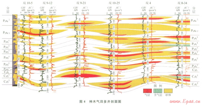 神木氣田具有多層系含氣特征(圖4),并且和煤田高度重疊,開發(fā)難度較大,叢式井鉆完井技術進步顯著提高了神木氣田開發(fā)水平。2012年神木氣田完鉆124口井,其中5口井以上的叢式井組14個85口井,最大叢式井組轄井11口,完試46口,平均無阻流量12.35×104m3/d。