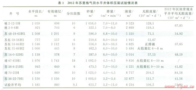 致密氣藏體積壓裂取得關鍵性突破。以“提高凈壓力,開啟和支撐支裂縫”為關鍵點,在脆性指數(shù)、微裂隙發(fā)育程度、二三向應力場、抗張抗剪切強度研究基礎上,建立了致密氣藏體積壓裂的設計模式。自主研發(fā)了Æll4.3mm裸眼封隔器、懸掛封隔器、回接管等關鍵工具,設計了Æll4.3mm基管注入小級差滑套分壓管柱,可實現(xiàn)一次連續(xù)分壓23段,最大排量可達到12m3/min,適應了體積壓裂“大排量、大液量、大砂量”的需要。2012年長慶氣區(qū)實施體積壓裂改造11口井,平均試氣無阻流量超百萬立方米,取得明顯效果(表1)。通過井下微地震監(jiān)測,蘇東55-66H2井裂縫半長235~560m,裂縫高度42~79m,裂縫帶寬100~220m。表明通過體積壓裂,橫向突破阻流帶,縱向突破隔夾層,形成了復雜縫網(wǎng),改造體積較常規(guī)壓裂增加2倍以上。