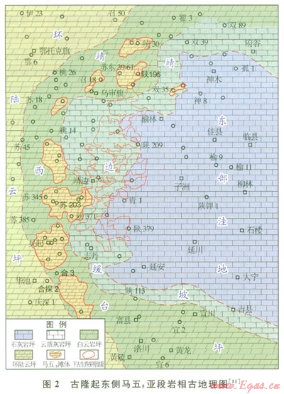 受沉積期古隆起控制,奧陶系下古生界中組合馬五5亞段沉積相呈環(huán)帶狀展布[9],局部發(fā)育的顆粒灘沉積經白云巖化形成高滲儲層。在靖邊氣田西側由于馬五1一馬五4段區(qū)域剝蝕,馬五5亞段與上古生界煤系烴源巖直接接觸,有利于天然氣富集成藏[10]。
