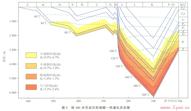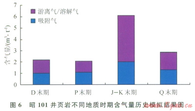筆者以昭101井、l03等井為例開展了歷史模擬和流體包裹體分析,證實了斷裂對氣藏起強烈破壞這一判斷。昭通除靠近四川盆地的小部分區(qū)域外,多數(shù)鉆井都不成功,含氣量低(0.05~0.50m3/t)。昭通與蜀南相鄰,應(yīng)該大致經(jīng)歷了相似的演化歷程(圖5),含氣性差別大。昭101井位于芒部背斜,地表斷裂發(fā)育。目的層筇竹寺組因斷裂出現(xiàn)地層重復(fù),頁巖裂隙發(fā)育、方解石充填嚴(yán)重,含氣量的現(xiàn)場分析結(jié)果不足0.1m3/t,評價為極低含氣量,基本全部逸散。開展的昭101井熱演化歷史和含氣量歷史模擬研究表明:昭通地區(qū)J-K末期含氣量最大,如果穩(wěn)定抬升頁巖將出現(xiàn)超壓,含氣量應(yīng)該至少介于3~5m3/t,但是目前小于0.1m3/t(圖6)。