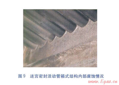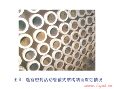 經研究,認為采用非金屬材料的迷宮密封結構可以有效消除縫隙腐蝕的發(fā)生,迷宮密封活動管箱式結構見圖7。鍍搪瓷鋼管穿入迷宮密封套中(內環(huán)面加工有迷宮鋸齒槽),迷宮鋸齒槽與鋼管外表面形成若干道迷宮腔,從而實現了密封。迷宮密封活動管箱式結構不但具有端面填料函密封的活動管箱式結構的優(yōu)點,還由于換熱管與箱體板之間有柔性迷宮密封套隔離,避免了在安裝、運行過程中對搪瓷層的破壞,從本質上消除了縫隙腐蝕的發(fā)生[5]。經技術改造后的空氣預熱器,連續(xù)運行2年后運行狀況依然良好,箱體板及換熱管各部位基本上沒有發(fā)生腐蝕(見圖8、9)。