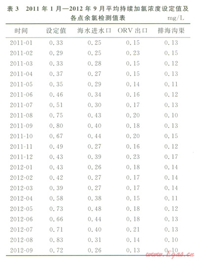 2009年1月至2012年9月,接收站加氯裝置一直連續(xù)運轉(zhuǎn),采用單臺設備運行的方式,加氯濃度的設定同時考慮ORV承受能力及外排海水余氯環(huán)保要求。期間平均持續(xù)加氯濃度設定值及各點余氯檢測值見表2、3。