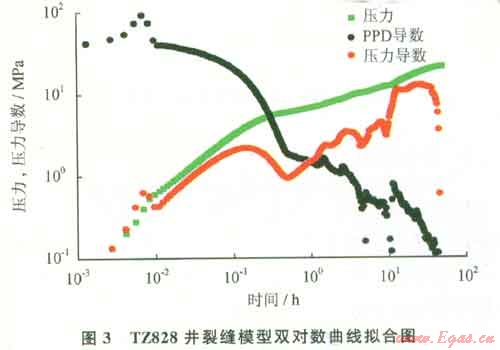 裂縫井模型也是塔中碳酸鹽巖儲層的主要類型之一,此類井由于基質(zhì)孔滲條件差,能量補給不足,相應(yīng)的產(chǎn)能低、遞減快。如TZ828井,5595~5603m儲層的沉積環(huán)境主要為粒屑灘、礁丘亞相,礁翼、中高能砂屑灘微相。巖性生屑砂屑灰?guī)r、層孔蟲骨架巖,含大量棘屑、發(fā)育溶洞、灰色生物礁灰?guī)r、見高角度構(gòu)造縫和蜂窩狀溶蝕孔洞。孔隙度平均值為1.8%,儲層類型以Ⅰ、Ⅱ類為主。試油期間開井流動曲線近似一條直線,開井期間地面無產(chǎn)出,表明地層無自噴能力;關(guān)井壓力曲線恢復(fù)緩慢,反映儲層為低滲透儲層。二次關(guān)井導(dǎo)數(shù)曲線后期出現(xiàn)不規(guī)則,是由于井筒相變的影響造成的,如圖3所示,試井解釋只能用10h以內(nèi)的數(shù)據(jù)。