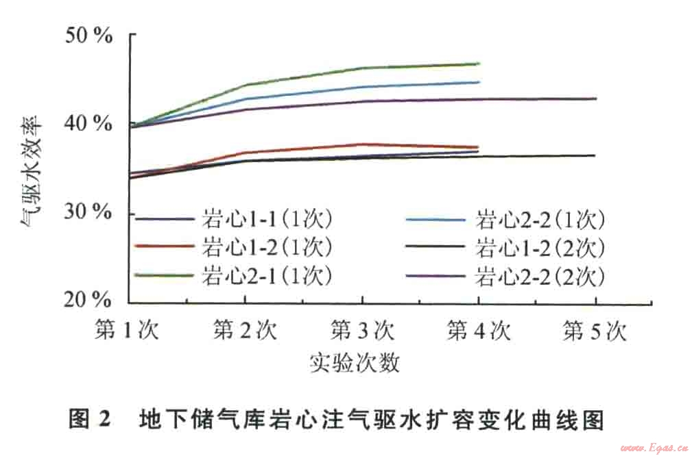 實(shí)驗(yàn)結(jié)果揭示:地下儲(chǔ)氣庫(kù)內(nèi)的含水區(qū)可以實(shí)現(xiàn)較高的氣體驅(qū)替,4塊巖心的氣驅(qū)試驗(yàn)壓力降落區(qū)間為地下儲(chǔ)氣庫(kù)原始?jí)毫Φ?00%~29%時(shí),第l次氣體驅(qū)替效率可達(dá)到34%~40%,第2、3次累加氣驅(qū)效率可達(dá)36%~46%;地下儲(chǔ)氣庫(kù)實(shí)際注采生產(chǎn)過程中隨多周期的注采驅(qū)替,氣驅(qū)水達(dá)容效率是逐步增加的過程,或者說若要實(shí)現(xiàn)地下儲(chǔ)氣庫(kù)較高的氣體驅(qū)替效率,則需要多年的注采周期。