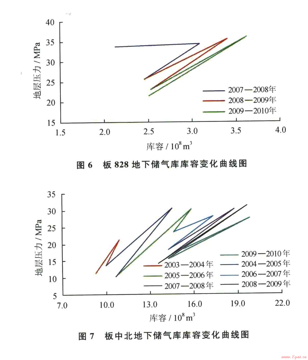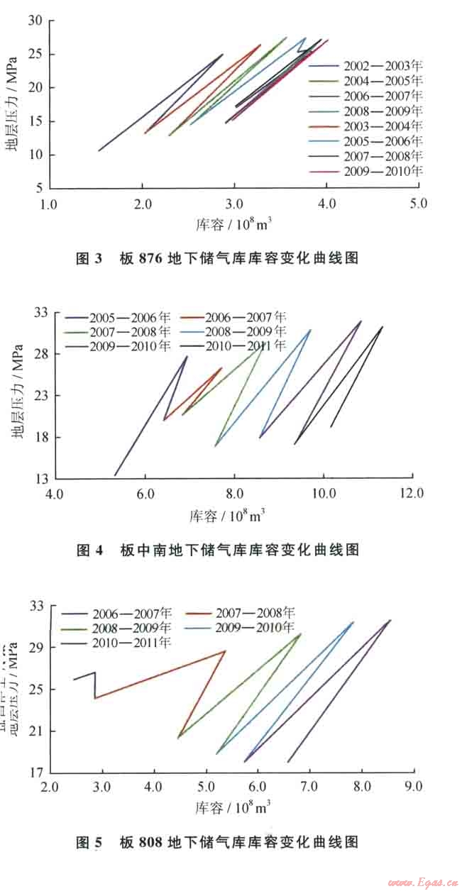 1)地下儲(chǔ)氣庫(kù)庫(kù)容量呈現(xiàn)逐漸增加的趨勢(shì),并最終趨于最大庫(kù)容量。以注氣期結(jié)束時(shí)的庫(kù)容量為地下儲(chǔ)氣庫(kù)的當(dāng)期庫(kù)容量,采氣期結(jié)束時(shí)的庫(kù)容量為地下儲(chǔ)氣庫(kù)的當(dāng)期墊氣量,庫(kù)容量與墊氣量之差即為當(dāng)期工作氣量(采氣量)。從地下儲(chǔ)氣庫(kù)的實(shí)際庫(kù)容量變化曲線看(圖3~7),隨著地下儲(chǔ)氣庫(kù)注采周期的增加,庫(kù)容曲線普遍右移,地下儲(chǔ)氣庫(kù)庫(kù)容明顯增大,而且注采周期越多,庫(kù)容增加愈多。板876地下儲(chǔ)氣庫(kù)運(yùn)行5~8個(gè)注采周期時(shí),庫(kù)容變化曲線基本重疊,表明地下儲(chǔ)氣庫(kù)已達(dá)到最大庫(kù)容量。由此也說明地下儲(chǔ)氣庫(kù)達(dá)容是一個(gè)長(zhǎng)期的過程。從已建地下儲(chǔ)氣庫(kù)的達(dá)容特征看,水淹型地下儲(chǔ)氣庫(kù)的達(dá)容周期超過5年。