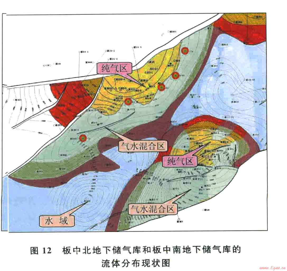 地下儲(chǔ)氣庫(kù)的構(gòu)造特征影響著達(dá)容的速度。對(duì)于完整的背斜或單斜構(gòu)造型地下儲(chǔ)氣庫(kù),邊部水體在建庫(kù)前的氣藏開采階段,由低向高的水侵結(jié)果通常使低部位含水多高部位含水少,流體分布遵循上輕下重的重力分異規(guī)律。當(dāng)?shù)叵聝?chǔ)氣庫(kù)采取由高向低的注氣驅(qū)水達(dá)容方案時(shí),這種規(guī)律性表現(xiàn)得更突出,這是由實(shí)踐證實(shí)的普遍性規(guī)律。板中北高點(diǎn)地下儲(chǔ)氣庫(kù)7個(gè)注采周期后的流體分布狀態(tài)如圖l2所示。對(duì)于內(nèi)部存在較多斷層的破碎型地下儲(chǔ)氣庫(kù),由于斷層的阻隔作用,只能形成局部性的小單元注氣驅(qū)水達(dá)容過程,通常由于范圍小、井?dāng)?shù)少,無法實(shí)現(xiàn)高部位注氣向低部位驅(qū)水的理想過程,造成小單元內(nèi)氣水分布混雜、驅(qū)水達(dá)容效果差,進(jìn)而影響到整個(gè)地下儲(chǔ)氣庫(kù)驅(qū)水達(dá)容的效果。如板中南地下儲(chǔ)氣庫(kù)整體形態(tài)為一背斜構(gòu)造(見圖12),但由于內(nèi)部發(fā)育有5條小斷層,造成多個(gè)小單元自成系統(tǒng),難以實(shí)現(xiàn)完善的氣體驅(qū)水注采關(guān)系,影響了達(dá)容效率,延長(zhǎng)了達(dá)容時(shí)問。板中南地下儲(chǔ)氣庫(kù)5個(gè)注采周期后的流體分布狀態(tài)如圖l2所示。
