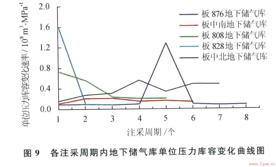 盡管地下儲(chǔ)氣庫(kù)的達(dá)容過程具有前快后慢的特點(diǎn),但地下儲(chǔ)氣庫(kù)從第2注采周期開始,單位壓力下庫(kù)容的變化量即彈性庫(kù)容率卻基本維持在一個(gè)穩(wěn)定值,盡管不同地下儲(chǔ)氣庫(kù)的該數(shù)值不同,但同一地下儲(chǔ)氣庫(kù)彈性庫(kù)容率基本穩(wěn)定的規(guī)律相同。地下儲(chǔ)氣庫(kù)單位壓力庫(kù)容變化曲線圖9所示。同理,在圖3~7中每個(gè)地下儲(chǔ)氣庫(kù)不同注采周期的曲線斜率也基本相同,反映每一個(gè)地下儲(chǔ)氣庫(kù)在壓力運(yùn)行區(qū)間內(nèi)單位壓力變化所波及的有效孔隙空間容積基本不變。由此推測(cè),實(shí)際上地下儲(chǔ)氣庫(kù)內(nèi)的氣水與地下儲(chǔ)氣庫(kù)外部的弱水體總體上組成了同一氣水系統(tǒng),類似于定容氣水系統(tǒng)的特征。以板876地下儲(chǔ)氣庫(kù)為例,在地下儲(chǔ)氣庫(kù)生產(chǎn)運(yùn)行的8個(gè)注采周期中,除第5注采周期生產(chǎn)管理因素外,其余各注采周期的彈性庫(kù)容率基本相同,無論庫(kù)容增速快慢或庫(kù)容量大小變化,但彈性庫(kù)容率卻基本不變。但板中北地下儲(chǔ)氣庫(kù)卻是個(gè)特例,其具有較強(qiáng)的邊部水體,在地下儲(chǔ)氣庫(kù)生產(chǎn)運(yùn)行的7個(gè)注采周期中,隨著注采周期增加庫(kù)容量逐漸增大,同期彈性庫(kù)容率也逐漸增大,反映了強(qiáng)邊水地下儲(chǔ)氣庫(kù)的庫(kù)容率變化規(guī)律。