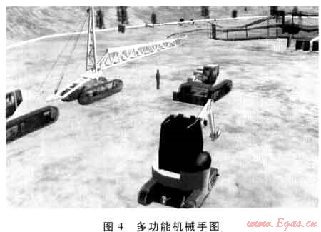 通過仿真平臺模擬展示了滅火搶險作業(yè)的核心設(shè)備——多功能機(jī)械手隅7。,充分展現(xiàn)了罩引火筒、挖掘清障、剪切清障、破碎井場水泥基礎(chǔ),運(yùn)送遠(yuǎn)距離水力噴砂切割頭、吊裝單件井口裝置等功能(圖4)。