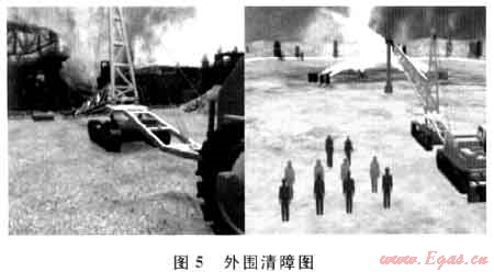 通過仿真平臺模擬井噴失控后帶火作業(yè)的帶火清障及井口清障過程[5~7],模擬搶險隊員進(jìn)行切割、拖拉作業(yè),直到徹底清除井架底座,采用引火筒將散狀火焰集中引導(dǎo)垂直向上,完成滅火前井口周圍的徹底清障,使井口完全暴露,如圖5所示。