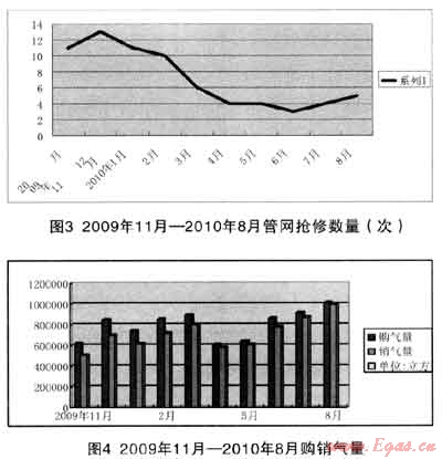 我公司2010年2月使用加濕技術(shù)時(shí)擁有干管鑄鐵閥門約61座,鑄鐵管網(wǎng)總長度84.8km,調(diào)壓站(箱)15個;日供氣能力約2.3萬m3。下面的一組圖表反映的是我公司2009-2010年加濕前后管網(wǎng)搶修及各月燃?xì)赓?、銷氣量及氣損統(tǒng)計(jì)情況: