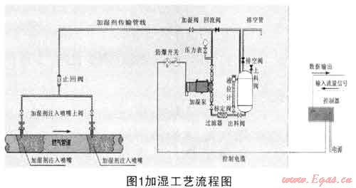 宜春深燃天然氣有限公司自2010年2月開始使用溶劑油加濕劑對天然氣進(jìn)行加濕,溶劑油加濕工藝設(shè)備主要由控制器、儲藥罐、加濕泵、各閥門組、壓力表及加濕噴嘴等組成,工藝如圖1所示: