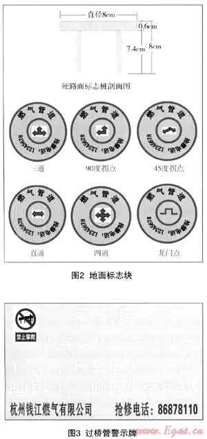 近年來下沙開發(fā)區(qū)城市建設(shè)加快,天然氣供氣規(guī)模也逐步擴(kuò)大,對管網(wǎng)的巡查要求較之過去已大大提高。之前設(shè)置的管線標(biāo)志樁形狀大小不一,外型不美觀,且安裝設(shè)置也不夠規(guī)范,還存在缺失現(xiàn)象。巡線工需要依靠竣工圖紙來確定管位,但圖紙與實(shí)際管位還是存在不符的情況,故較難有效落實(shí)巡線工作,無法保證巡線質(zhì)量,成為完善燃?xì)夤艿兰霸O(shè)施日常維護(hù)、管理和保護(hù)的基礎(chǔ)工作的一道障礙。所以燃?xì)夤艿涝O(shè)施標(biāo)識設(shè)置的標(biāo)準(zhǔn)化已迫在眉睫,規(guī)范統(tǒng)一的安全標(biāo)識設(shè)置可以方便地實(shí)現(xiàn)對燃?xì)夤艿篮驮O(shè)施的定位,同時(shí)可以起到警告保護(hù)作用。另外,新穎美觀的標(biāo)識也可樹立燃?xì)馄髽I(yè)形象,并起到安全宣傳的作用。