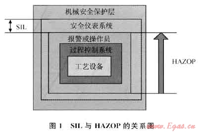本文參考文獻[6-9]就SIL在不同SIS中的應用情況,分析了SIL技術(shù)的評估方法、過程和應用環(huán)境,不過都把SIL作為一種獨立的分析方法應用在評估對象上。本文參考文獻[10]給出了SIL與HAZOP的關(guān)系圖,如圖1所示。圖1中SIL評估與HAZOP分析以明確的界限分隔開來,這種劃分是建立在保護層分析(LOPA)基礎(chǔ)上的。實際上,SIL評估的主要對象是安全儀表系統(tǒng),但是在驗證SIL等級時,是需要分析基本控制單元、系統(tǒng)報警和人工操作情況的,而HAZOP分析控制系統(tǒng)的防護措施時也會涉及安全儀表系統(tǒng),二者之間是存在交叉區(qū)域的。