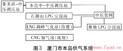 廈門市本島供氣系統(tǒng)見圖3。鑒于本島地理位置(四面環(huán)海,外圍既無高壓管道,也無地下儲氣庫)的特點(diǎn),LNG氣化站是城市管網(wǎng)供氣高峰調(diào)峰和事故應(yīng)急的首選方式。