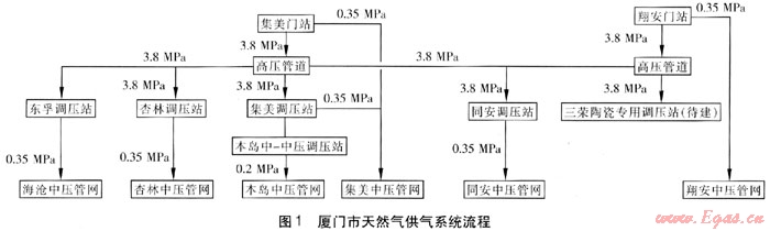 廈門市液化天然氣利用工程于2008年1月全面開工建設(shè),是福建省LNG工程總體項(xiàng)目的9個(gè)子項(xiàng)目之一。2010年建設(shè)規(guī)模為年供氣1.5568×108m3/a,最大供氣量為53.4×104m3/d,供應(yīng)居民用戶約30.9×104戶。該工程主要分為兩部分:a.天然氣高中壓輸配系統(tǒng)。建設(shè)門站2座(集美門站、翔安門站)、高-中壓調(diào)壓站4座(東孚調(diào)壓站、杏林調(diào)壓站、集美調(diào)壓站、同安調(diào)壓站)和中-中壓調(diào)壓站1座(本島調(diào)壓站);敷設(shè)高壓輸氣管道27.78km,中壓輸氣管道12.22km,中壓輸配管道488.45km。工程總造價(jià)達(dá)6.28×108元。b.置換和發(fā)展天然氣用戶62×104戶。廈門市天然氣供氣系統(tǒng)流程見圖1。