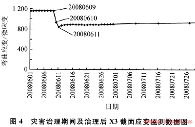 2008年4月29日及2008年5月2日的兩次強降雨,使該管段附近滑坡體蠕滑加劇,在雨中和雨后尤其明顯。由于管道與滑坡體之間摩擦力相互作用,隨著該滑坡體的蠕滑加劇,坡體內(nèi)的管道也發(fā)生相應(yīng)的急劇應(yīng)變變化。隨著兩次強降雨的逐漸遠去,滑坡體的蠕滑逐漸減緩并趨于穩(wěn)定,管道的應(yīng)變變化也趨于穩(wěn)定:2008年6月9日X3截面的彎曲應(yīng)變?yōu)?154.3個微應(yīng)變,較之于2008年5月8日,僅增加了21.2個微應(yīng)變。