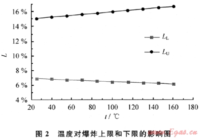 式中LU,t是溫度t時的爆炸上限;LL,t是溫度t時的爆炸下限;LU是t=25℃時的爆炸上限;LL是溫度為t=25℃時的爆炸下限;t為燃?xì)鉁囟取?/span>