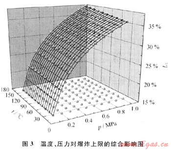 圖3給出了溫度和壓力對爆炸上限的綜合影響??梢钥闯鲭S著溫度、壓力的提高,爆炸極限范圍增大。在同一溫度下,壓力由0.1MPa升高到1.0MPa,其爆炸極限由15.14%擴大到35.74%。在同一壓力下,溫度由25℃升高到160℃,低壓時,爆炸上限幾乎沒有變化;在高壓時,爆炸上限由34.79%上升至35.74%??梢妷毫Ρㄉ舷薜挠绊懮跤跍囟葘ζ涞挠绊?。因此,在煤層氣的工業(yè)生產(chǎn)中,應(yīng)盡可能在低壓下操作。