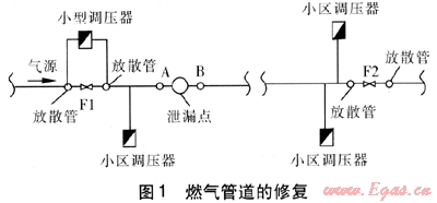 修復(fù)作業(yè)開始時(shí),派人在各調(diào)壓站監(jiān)測(cè)各小區(qū)中、低壓管網(wǎng)壓力,當(dāng)確定各小區(qū)均無大量用氣后,關(guān)閉泄漏點(diǎn)兩側(cè)的閥門F1、F2。在閥門F1、F2關(guān)閉后、放散燃?xì)馇?,將各小區(qū)低壓壓力提高到2940Pa后,關(guān)閉小區(qū)調(diào)壓器,以滿足少數(shù)用戶的用氣需求(如果作業(yè)時(shí)小區(qū)的低壓壓力低于784Pa,可打開小區(qū)調(diào)壓器旁通供氣)。在F2閥門左側(cè)的放散管進(jìn)行放散,將中壓壓力降至784~980Pa。壓力降到搶修工作壓力后,開始作業(yè)。秦皇島市燃?xì)夤艿来蟛糠质堑冉孛骅T鐵直管道,接口采用錐套式柔性接口,因此不論泄漏點(diǎn)是位于管道接口還是管道本身,要想修復(fù)均需切掉一段泄漏點(diǎn)所在的管道(長(zhǎng)約1m),更換新管道,重新使用連接套連接。切斷管道前,拆掉工作孔A、B上的閥門,塞入阻氣袋(防止切斷管道時(shí)放空燃?xì)?,混入空氣產(chǎn)生爆炸)。然后切斷管道并更換新管道,進(jìn)行接口連接等工作。接口連接完畢,撤出工作孔A處的阻氣袋,通過F1處的小型調(diào)壓器輸送燃?xì)?,用燃?xì)庵脫Q新管道內(nèi)的空氣。置換完成后,撤掉工作孔B處的阻氣袋,稍開閥門F1,使管內(nèi)壓力緩慢上升,達(dá)到運(yùn)行壓力后,對(duì)接口進(jìn)行查漏。查漏合格則完全打開閥門F1、F2。在完全開啟閥門F1、F2前,各調(diào)壓站人員關(guān)閉小區(qū)調(diào)壓器旁通閥,準(zhǔn)備恢復(fù)正常供氣。另外,如果小區(qū)壓力低于588Pa,且搶修發(fā)生在夜間,為防止出現(xiàn)用戶室內(nèi)事故,應(yīng)先關(guān)閉調(diào)壓器,在清晨用氣前進(jìn)行恢復(fù)供氣的宣傳,才能開啟調(diào)壓器進(jìn)行供氣;如果小區(qū)壓力大于588Pa,可把壓力直接調(diào)整到正常壓力恢復(fù)供氣。以上工作完成后,回填作業(yè)坑,清理現(xiàn)場(chǎng),作業(yè)結(jié)束。