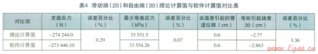 通過(guò)對(duì)兩種應(yīng)力計(jì)算結(jié)果的比較和誤差分析,很容易從上面列表中看出:理論計(jì)算值與軟件計(jì)算值中誤差最大者,即由管線自重引起的支座反力偶和最大彎曲應(yīng)力。這是由于軟件在計(jì)算過(guò)程中采用迭代法,而在理論計(jì)算中忽略了各投影面力矩之間互相關(guān)系的二次項(xiàng),從而造成兩者之間的誤差。因管線自重對(duì)整個(gè)管線應(yīng)力情況的影響最小,我們?cè)谶M(jìn)行管線應(yīng)力分析時(shí)主要考慮的管線影響因素就是溫度和內(nèi)壓。