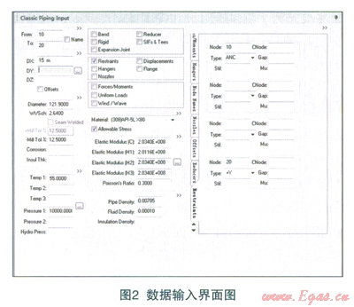 數(shù)據(jù)輸入界面見(jiàn)圖2,CAESARⅡ應(yīng)力分析模型圖見(jiàn)圖3。