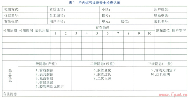 鑒于以上思路,以戶內(nèi)安檢崗位為例,在戶內(nèi)發(fā)生爆炸、爆燃等事故后,相關(guān)部門首先要對燃?xì)膺\(yùn)營部門是否按國家標(biāo)準(zhǔn)執(zhí)行檢查,是否落實(shí)檢查工作等問題進(jìn)行核實(shí),那么核實(shí)的依據(jù)就是戶內(nèi)燃?xì)庠O(shè)施安全檢查記錄。我們通常的記錄只有檢查人、地點(diǎn)、時間、存在隱患、處理結(jié)果、處理人及用戶簽字等項(xiàng)目,看起來比較完善,但就筆者來看還是差強(qiáng)人意,只是提供了一些表面證據(jù),沒有體現(xiàn)出更深層面的法律效應(yīng)。例如:我們的員工有沒有檢查資質(zhì),有沒有使用專業(yè)的檢測設(shè)備,檢測設(shè)備是否按時標(biāo)定,設(shè)置在戶內(nèi)的燃?xì)庠O(shè)施有沒有超出使用年限,燃?xì)庠O(shè)施設(shè)置是否保持原始設(shè)計(jì)等,都沒有在記錄中體現(xiàn)。燃?xì)膺\(yùn)營管理者應(yīng)該對其進(jìn)行完善,并在記錄中直觀體現(xiàn),而這幾項(xiàng)問題想要在記錄中得到體現(xiàn)就需要運(yùn)營企業(yè)投入資金來支撐,要對職工進(jìn)行培訓(xùn)取得資質(zhì),購入檢測設(shè)備并按時標(biāo)定。而燃?xì)庠O(shè)施設(shè)置是否保持原始設(shè)計(jì)的問題,筆者認(rèn)為應(yīng)該列入設(shè)備檔案管理,即:對戶內(nèi)安裝的燃?xì)庠O(shè)施形成影像記錄,儲存在計(jì)算機(jī)內(nèi),可隨時調(diào)閱來及時掌握燃?xì)庥脩羰欠襁M(jìn)行過更改。戶內(nèi)燃?xì)庠O(shè)施安全檢查記錄見表1。
