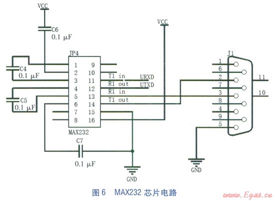 MAX232芯片是美信(MAXIM)公司專為RS232標(biāo)準(zhǔn)串口設(shè)計(jì)的單電源電平轉(zhuǎn)換芯片,使用5V單電源供電。通過MAX232電平轉(zhuǎn)換芯片將單片機(jī)TTL電平轉(zhuǎn)換為RS232電平,實(shí)現(xiàn)單片機(jī)與上位機(jī)的串行通信[4]。MAX232芯片電路見圖6。MAX232芯片的Tl in、Rl out引腳與單片機(jī)連接,Rl in、Tl out引腳與Jl(與上位機(jī)的串行接口)連接,其他引腳為一般常見接法。