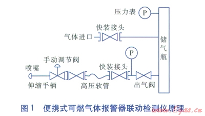 便攜式可燃?xì)怏w報(bào)警器聯(lián)動(dòng)檢測(cè)儀是一種用于檢測(cè)可燃?xì)怏w報(bào)警器工作狀態(tài)的裝置,它可以用指定濃度的可燃?xì)怏w(以下簡(jiǎn)稱(chēng)標(biāo)準(zhǔn)氣體)對(duì)報(bào)警器進(jìn)行檢測(cè),這樣既能夠測(cè)試報(bào)警器的工作狀態(tài)是否正常,同時(shí)還不對(duì)傳感器等靈敏部件造成損壞,其原理見(jiàn)圖l。