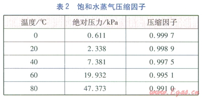 我公司橋東煤氣儲(chǔ)配站的人工煤氣來(lái)自邢臺(tái)旭陽(yáng)焦化有限公司,經(jīng)過(guò)脫萘、脫硫凈化處理后,主要組成見表l。經(jīng)站區(qū)流量計(jì)計(jì)量,進(jìn)入管網(wǎng),輸送至用戶,日均供氣量為17×104m3/d左右,用氣高峰期可達(dá)24×104m3/d。主干管采用DN 600mm的螺旋焊縫鋼管,長(zhǎng)度約l0km,管網(wǎng)運(yùn)行壓力為30~70kPa。在計(jì)量處測(cè)人工煤氣溫度,經(jīng)統(tǒng)計(jì),濕煤氣的溫度不超過(guò)50℃,處于水飽和狀態(tài)。表2為0~80℃的飽和水蒸氣壓縮因子值[1]。由表2可知,當(dāng)溫度不超過(guò)80℃,水蒸氣的飽和蒸氣壓很低,飽和水蒸氣壓縮因子與l的偏差小于1%,趨于理想氣體性質(zhì)。
